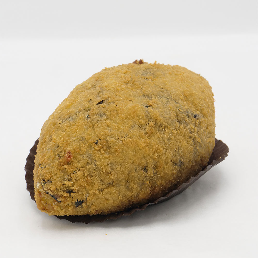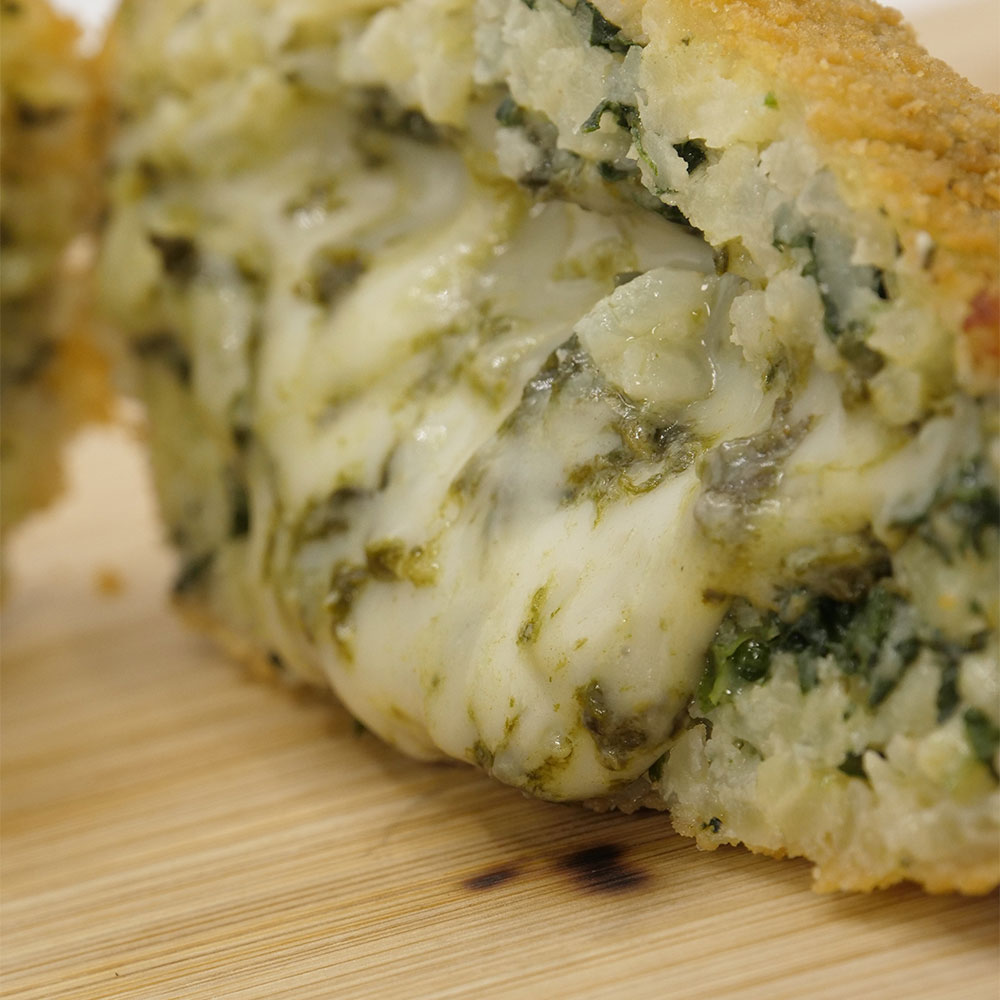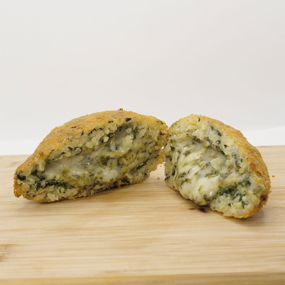 Acqua, riso, sale, pepe, dado vegetale, besciamella, edamer, burro e spinaci. Il tutto avvolto da panatura di acqua, farina e mollica.