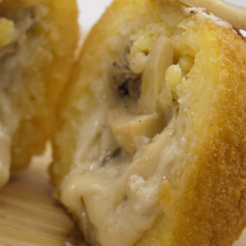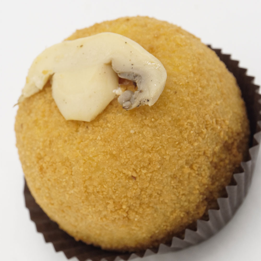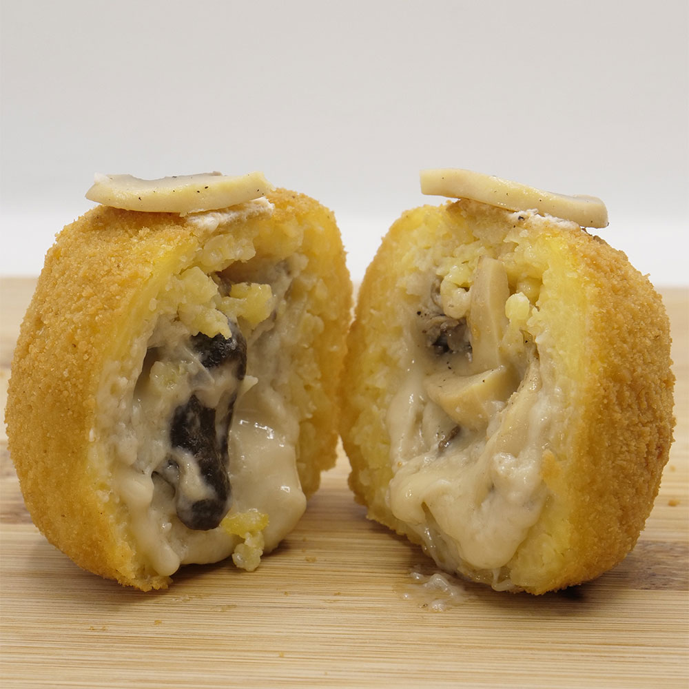 Acqua, riso, sale, pepe, dado vegetale, besciamella, edamer, burro e funghi. Il tutto avvolto panatura di acqua, farina e mollica.