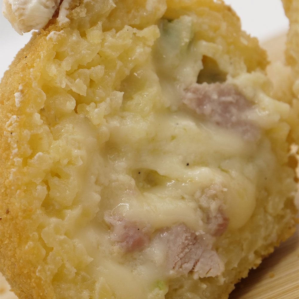 Acqua, riso, sale, pepe, dado vegetale, besciamella, piselli, prosciutto cotto, edamer, burro. Il tutto avvolto da panatura di acqua, farina e mollica.