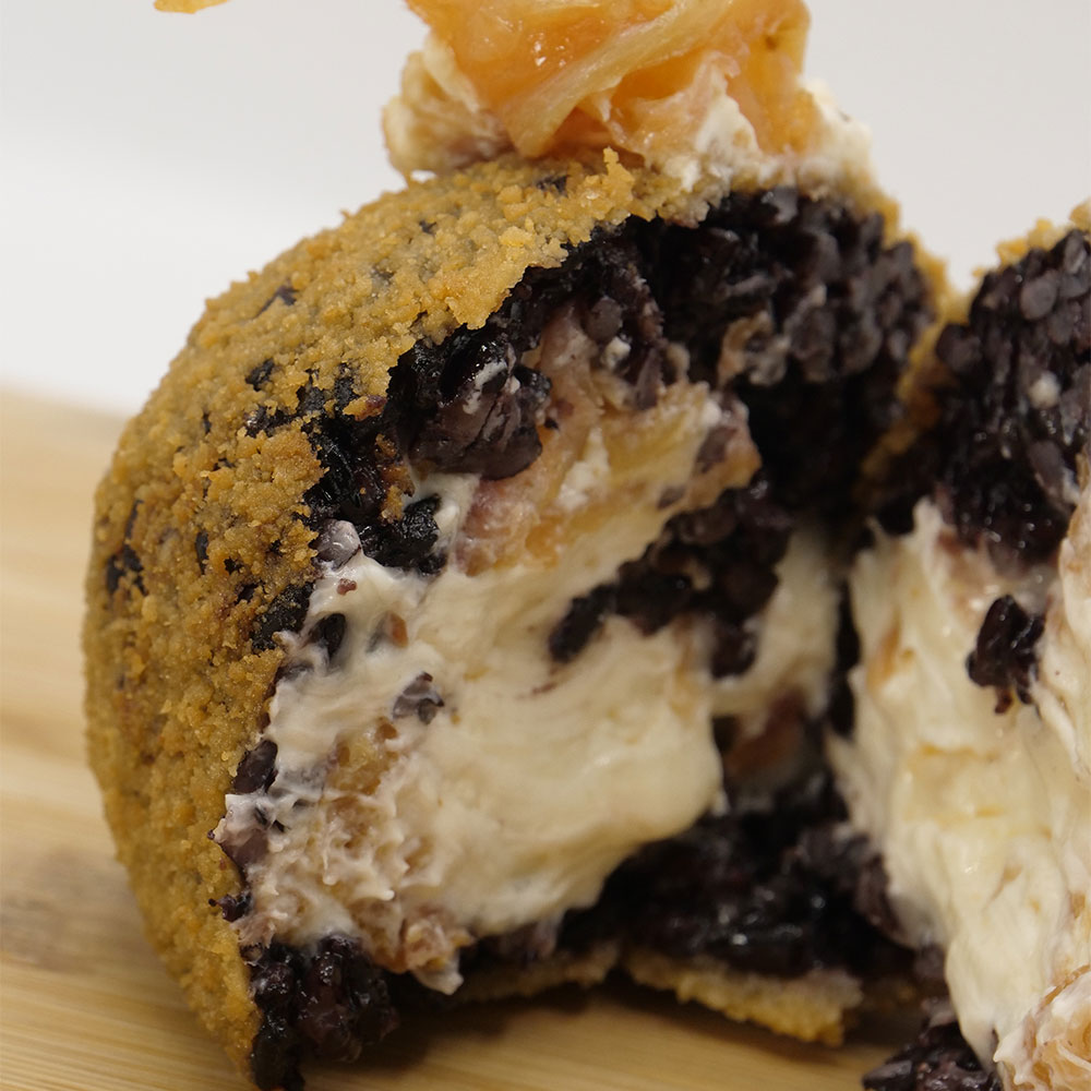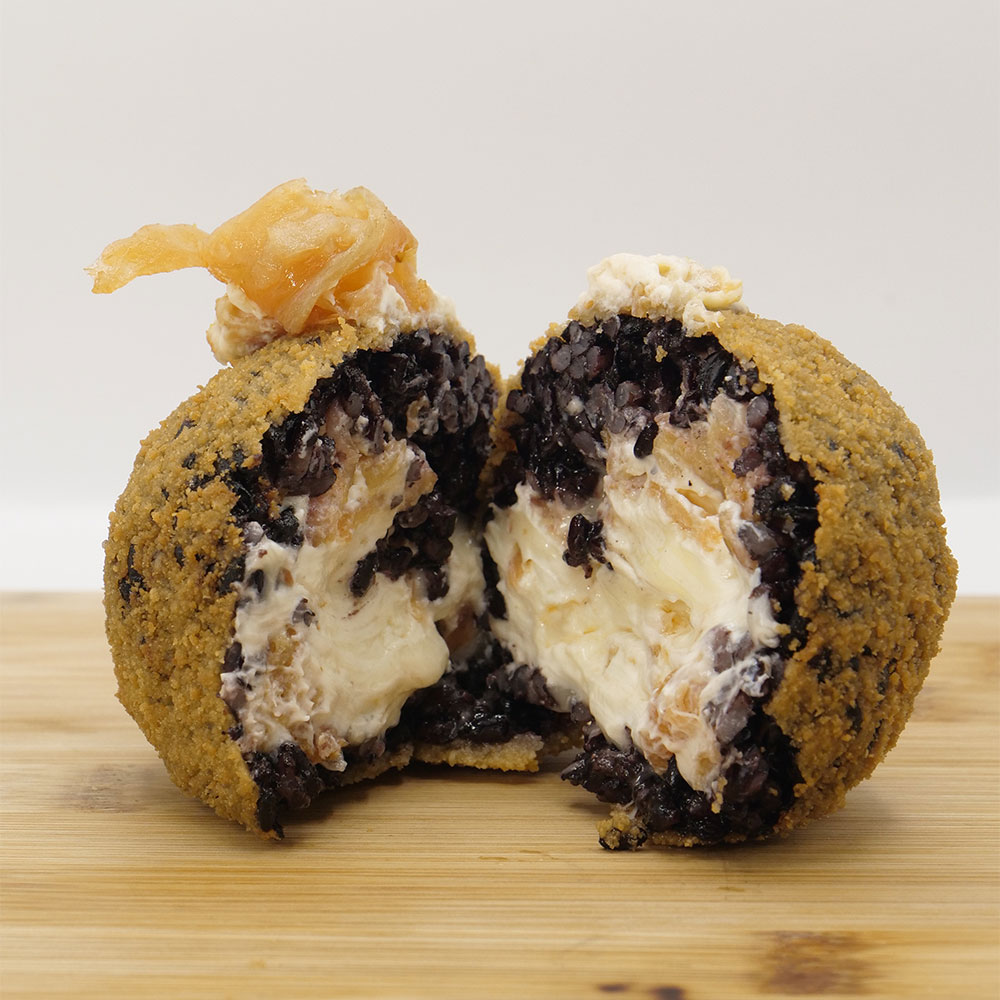 Acqua, riso venere, sale, pepe, dado vegetale, philadelphia, burro, edamer e salmone. Il tutto avvolto da panatura di acqua, farina e mollica.