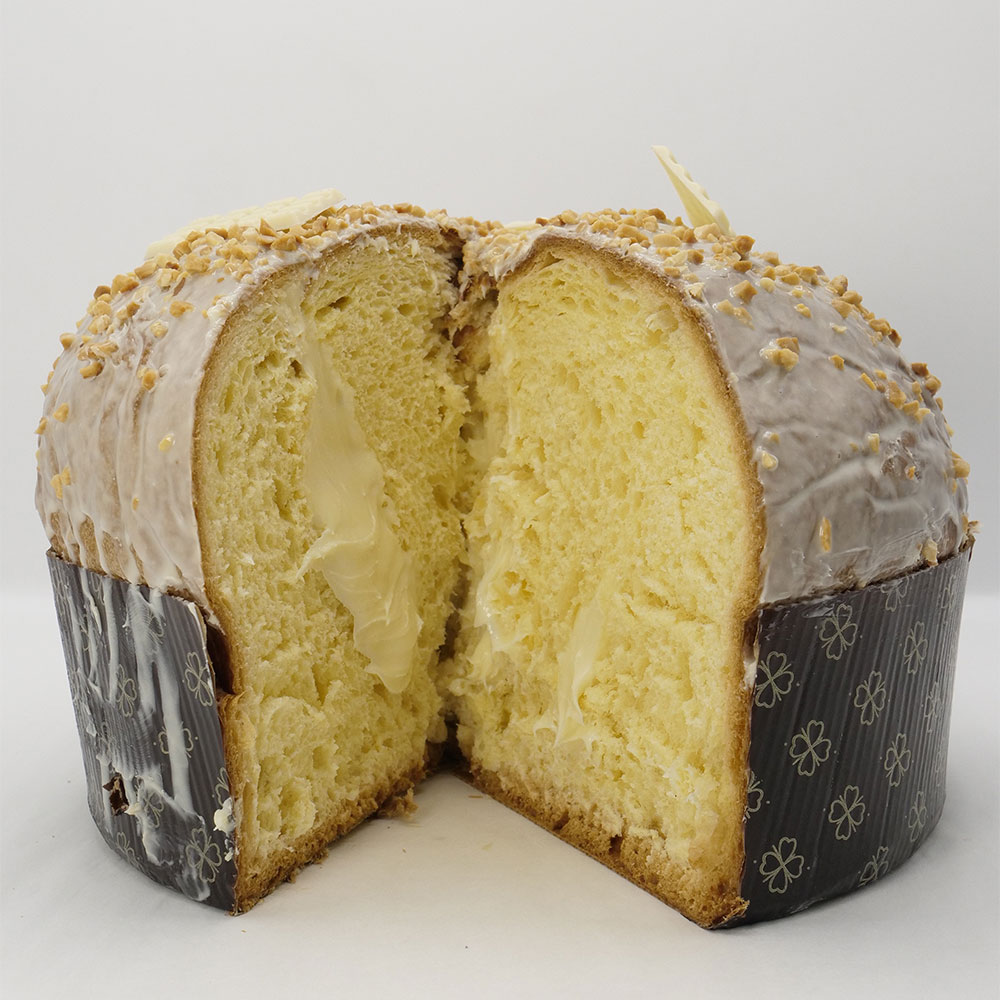 Farina, acqua, lievito, zucchero, tuorlo d’uova fresche e burro, farcitura Nutella bianca gusto Galak, copertura cioccolato bianco, nocciole e barrette cioccolato galak.